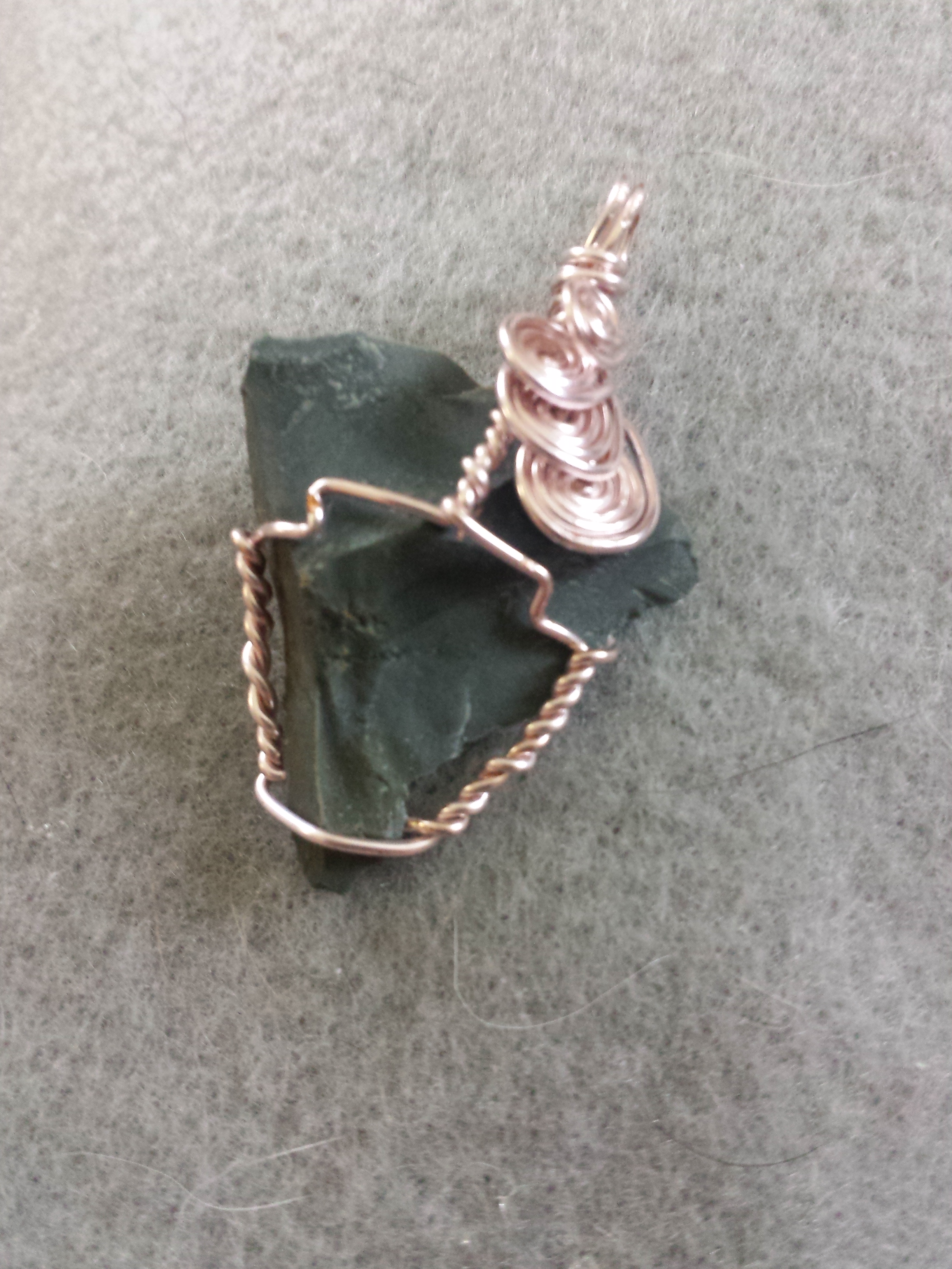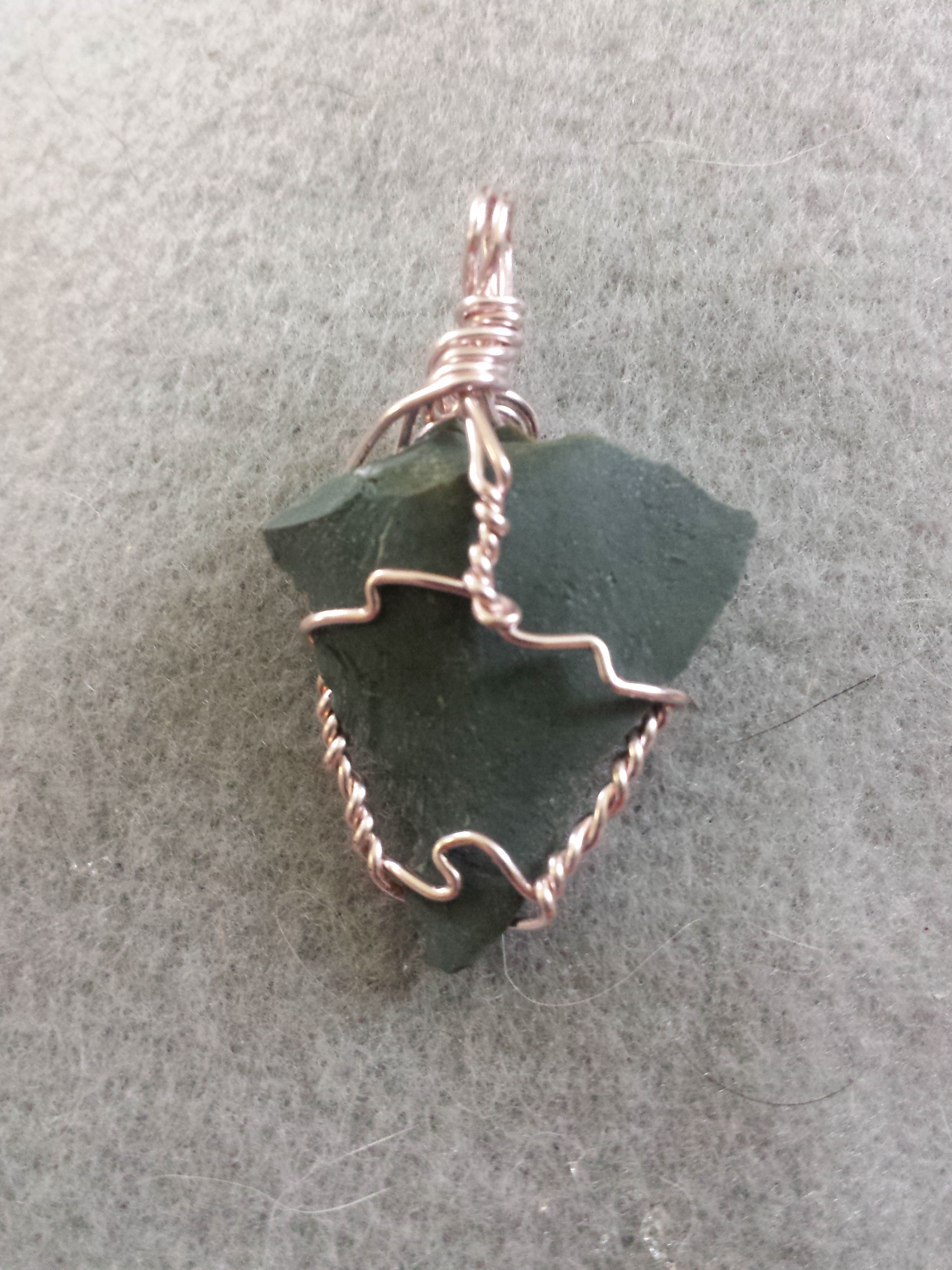 Grey, slate, stone arrowhead made by me in the traditional style of flaking(just like Neanderthal man used to do!). Perfect for that anthropologist in your life. Wrapped with pink plated wire and a cascade of spirals.