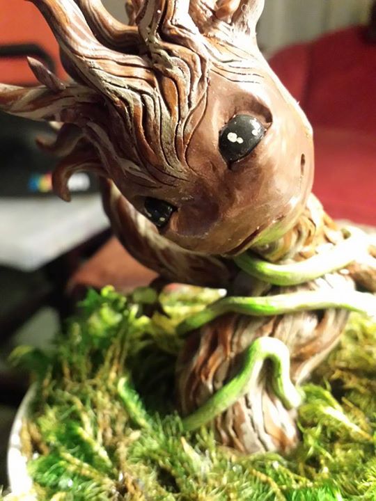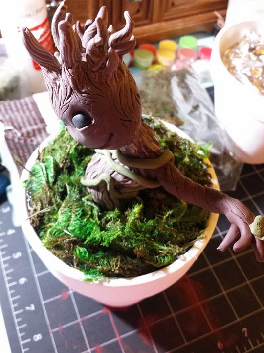 From Guardians of the Galaxy, comes your favorite little sapling! Groot is a baked polymer clay sculpture with painted details, complete with real moss around his base. Terracotta pot is painted white and Groot is sealed with a poly-acrylic spray. Each sculpture is OOAK and Groot will be in different dance positions.