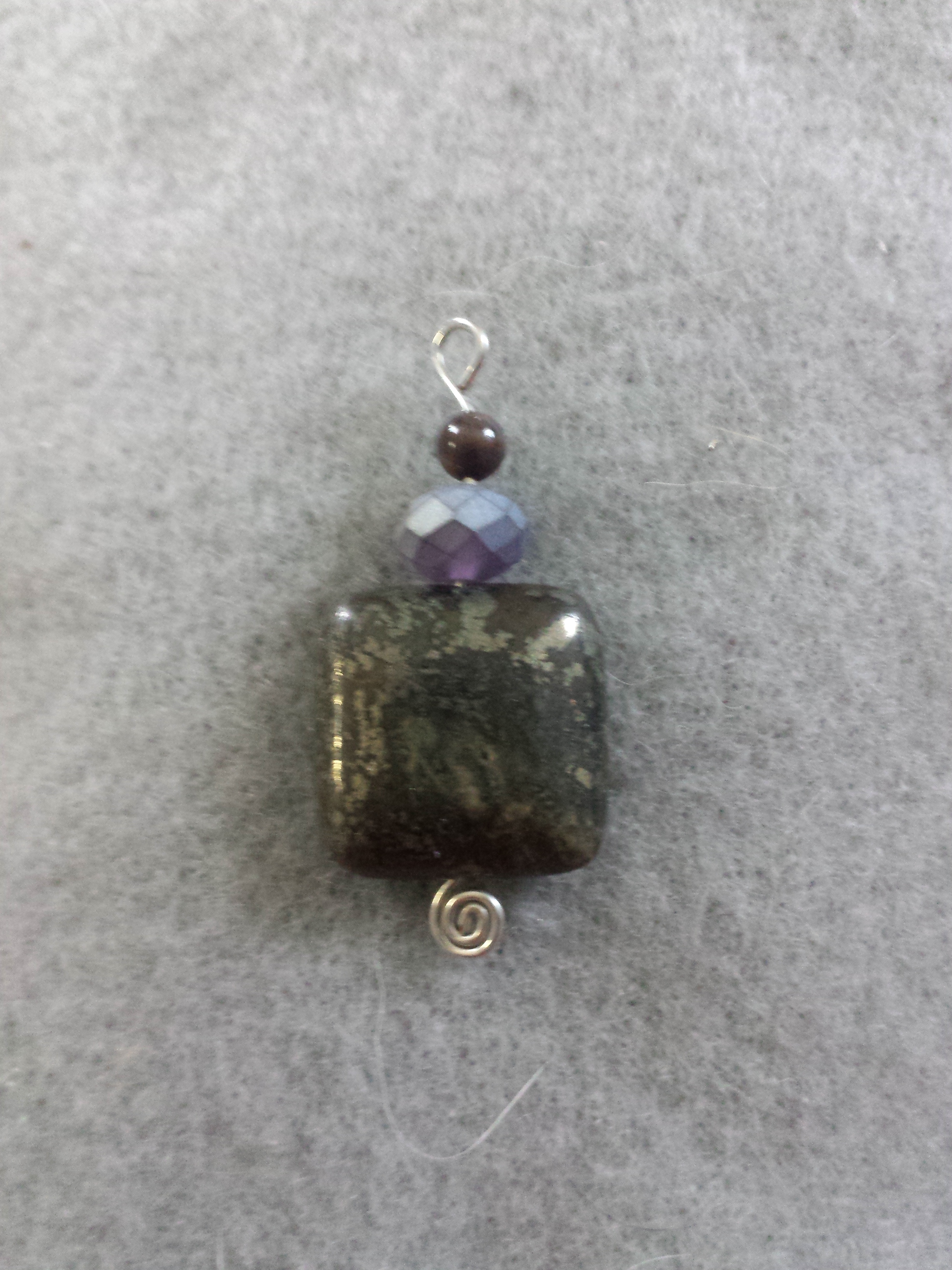 Metal stone rounded square bead with matte purple, faceted glass bead accent.