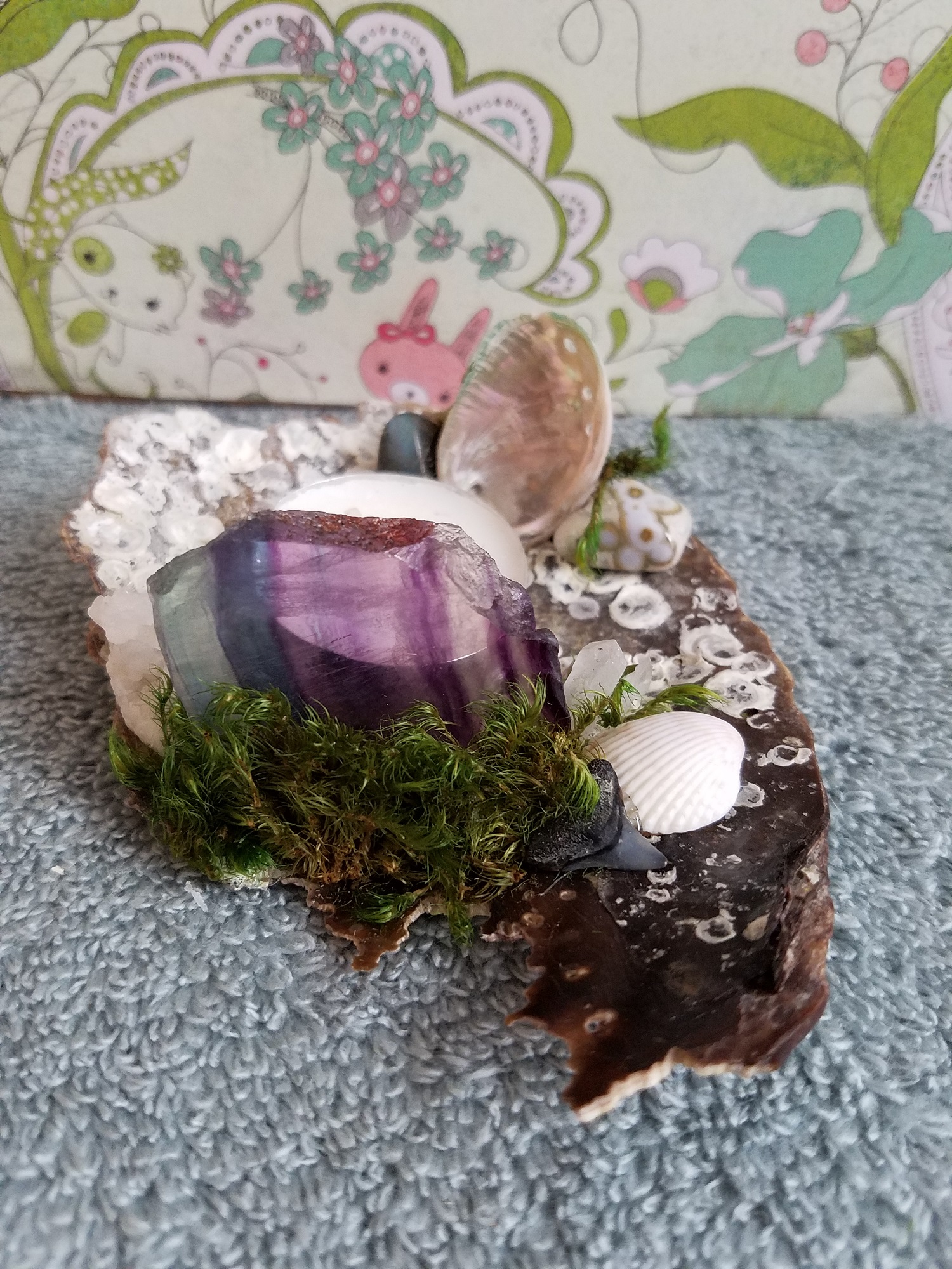 This altar contains quartz elements for healing and meditation, labradorite for self discovery, as well as a shark's tooth for luck! The tealight is set behind a slice of flourite for balance.