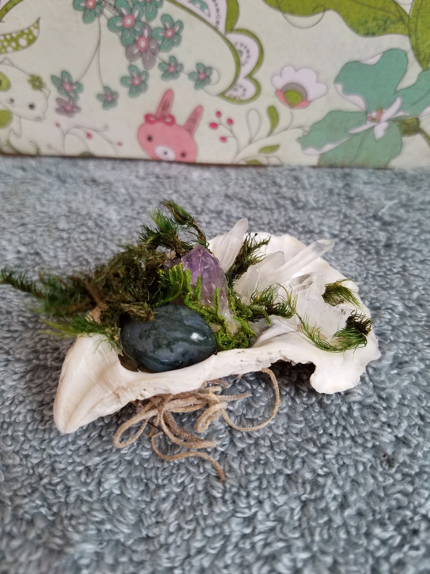 This altar contains quartz for healing and meditation, moss agate for the ladies, and amethyst for healing. There are also an assortment of shells, collected from Florida's Shell Island.