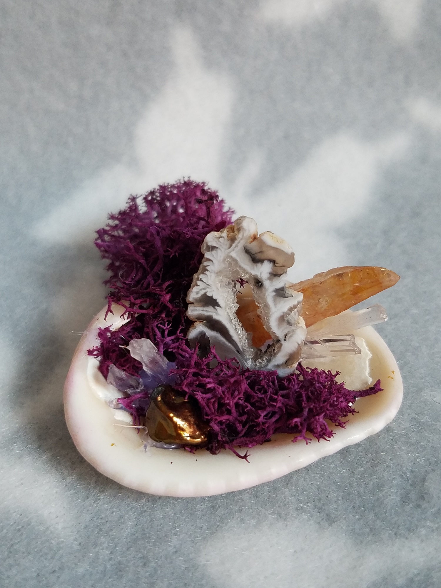 This altar contains quartz and orange angel aura quartz for healing and meditation.There is a nice big geode slice to give the diorama some height. There are also an assortment of shells, collected from Florida's Shell Island.
