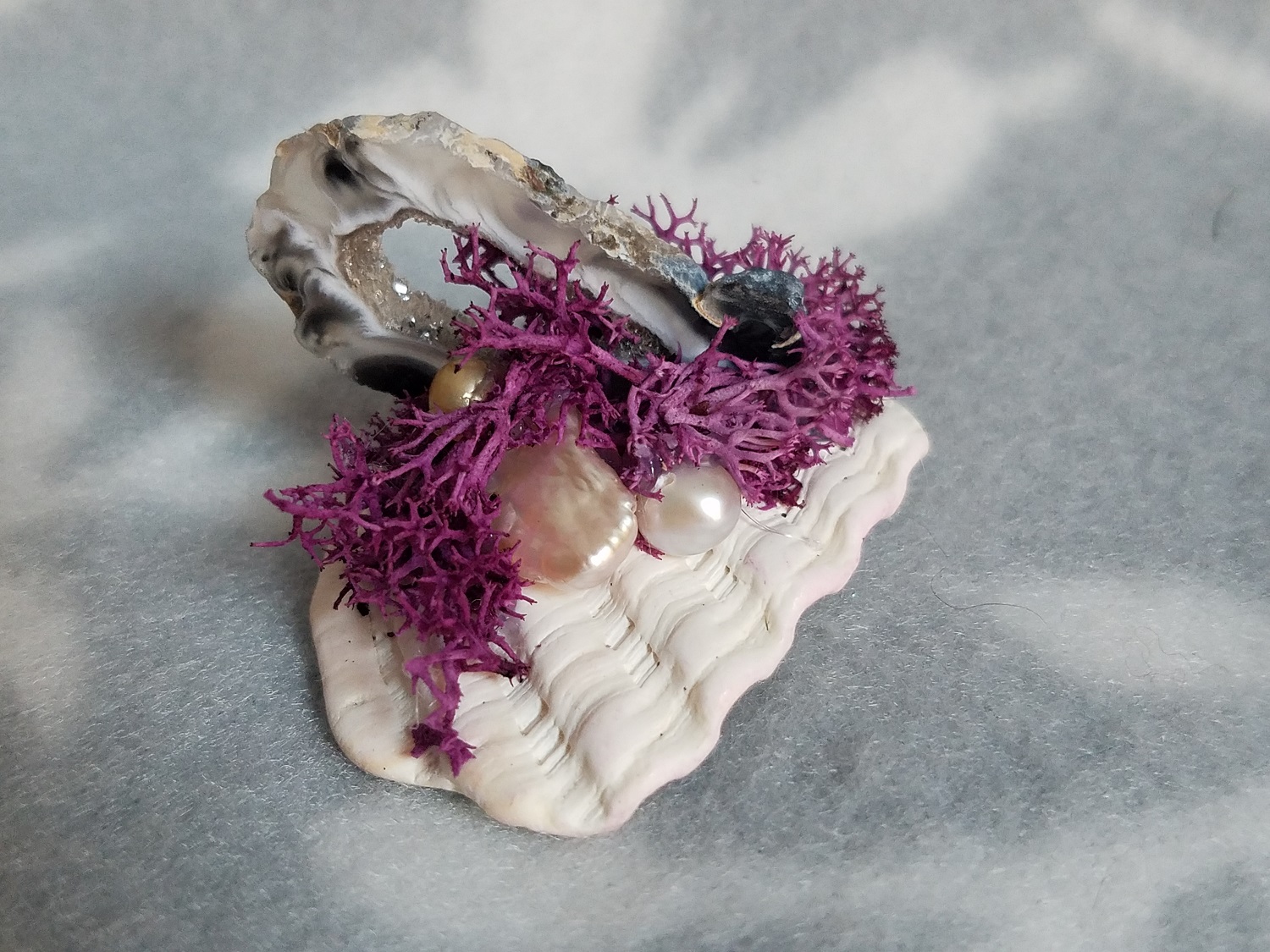 This altar has elements of freshwater pearls for light and shine. There is a nice big geode slice to give the diorama some height. There are also an assortment of shells, collected from Florida's Shell Island.