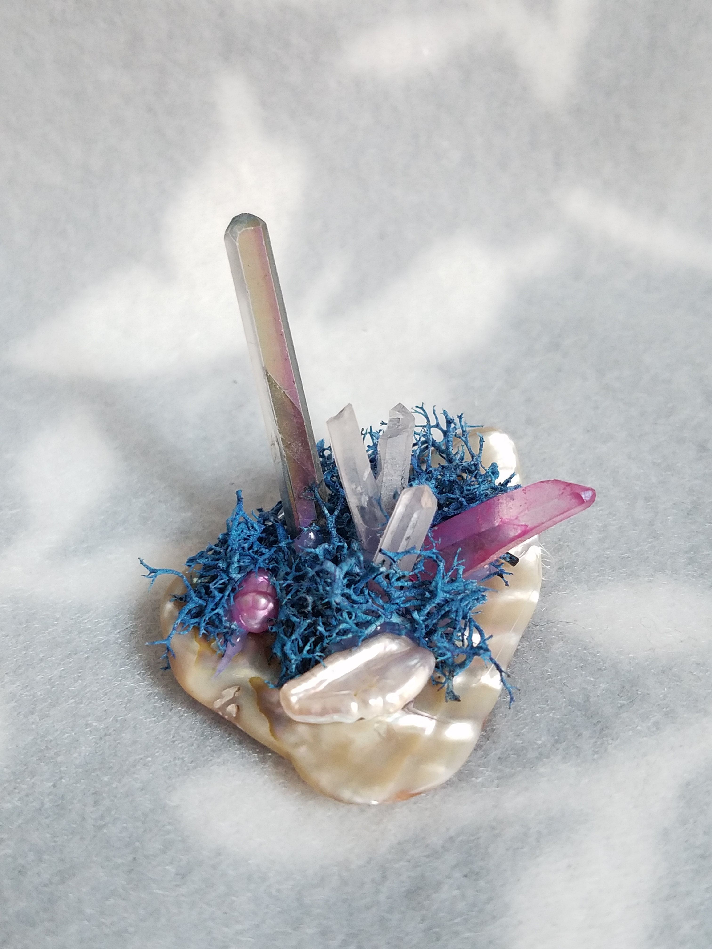 This altar contains quartz and aura quartz for healing and meditation and freshwater pearls for light and shine. There are also an assortment of shells, collected from Florida's Shell Island.