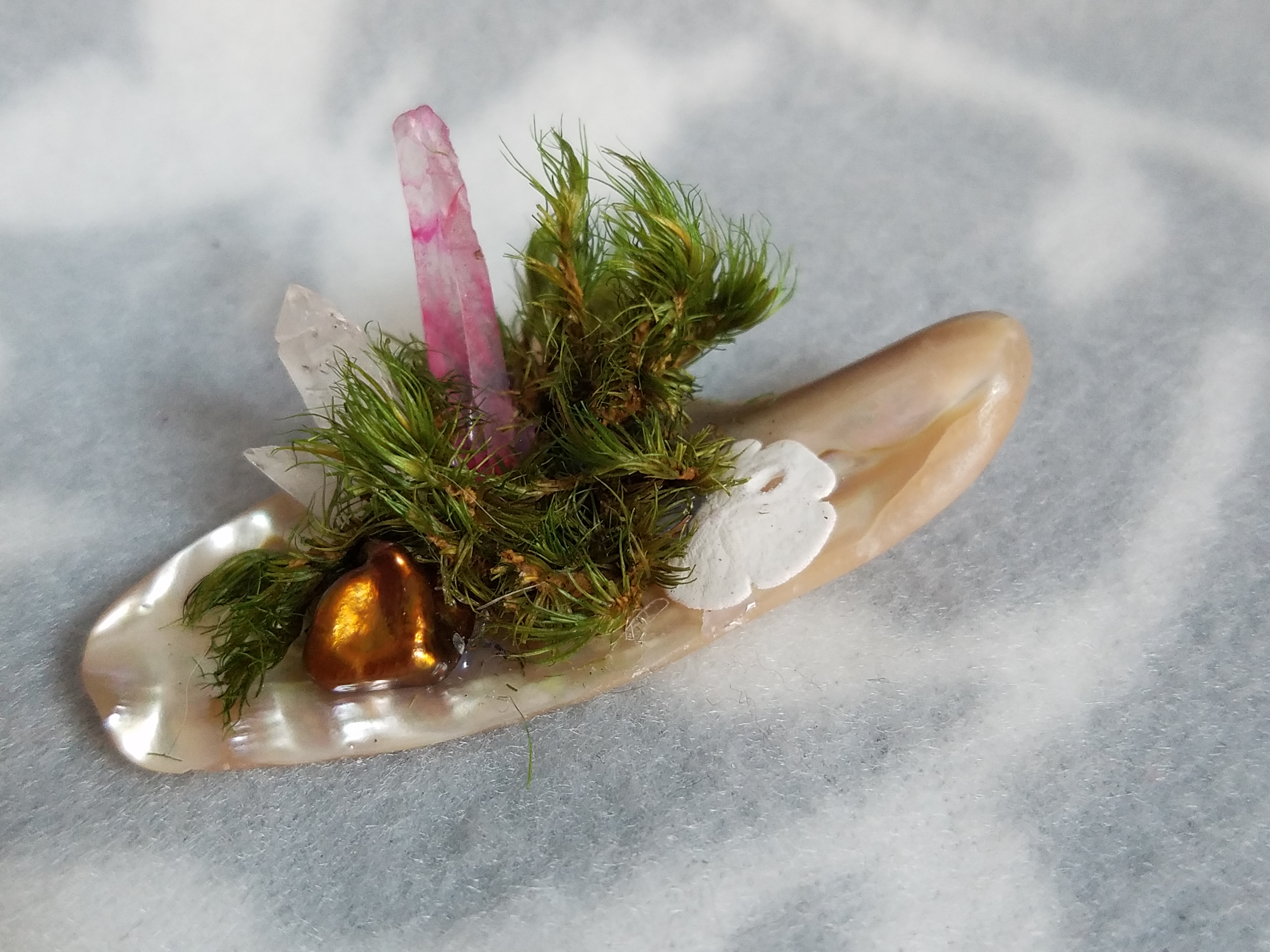 This altar contains quartz for healing and meditation, a freshwater pearl, and a tiny sand dollar! There are also an assortment of shells, collected from Florida's Shell Island.