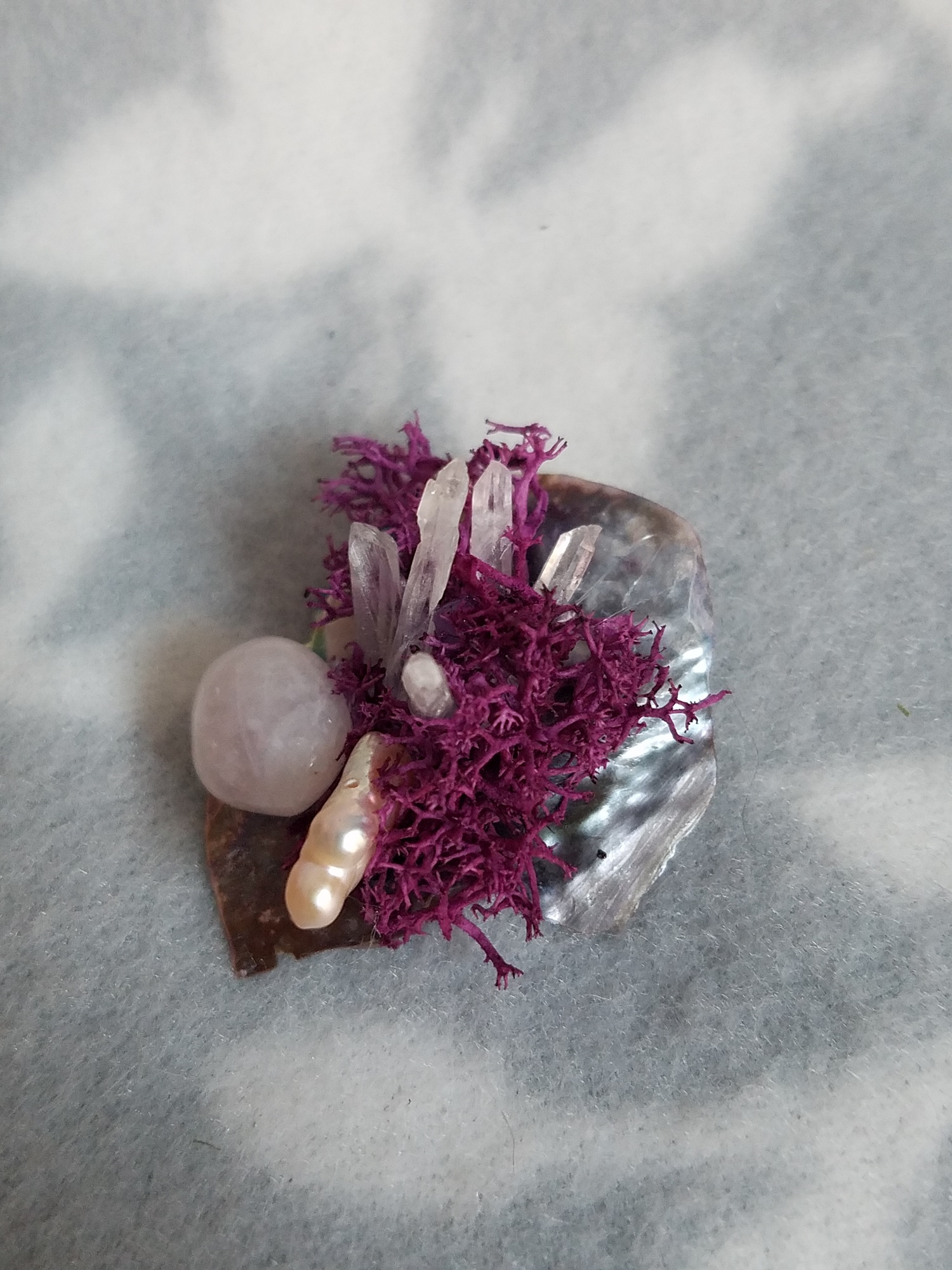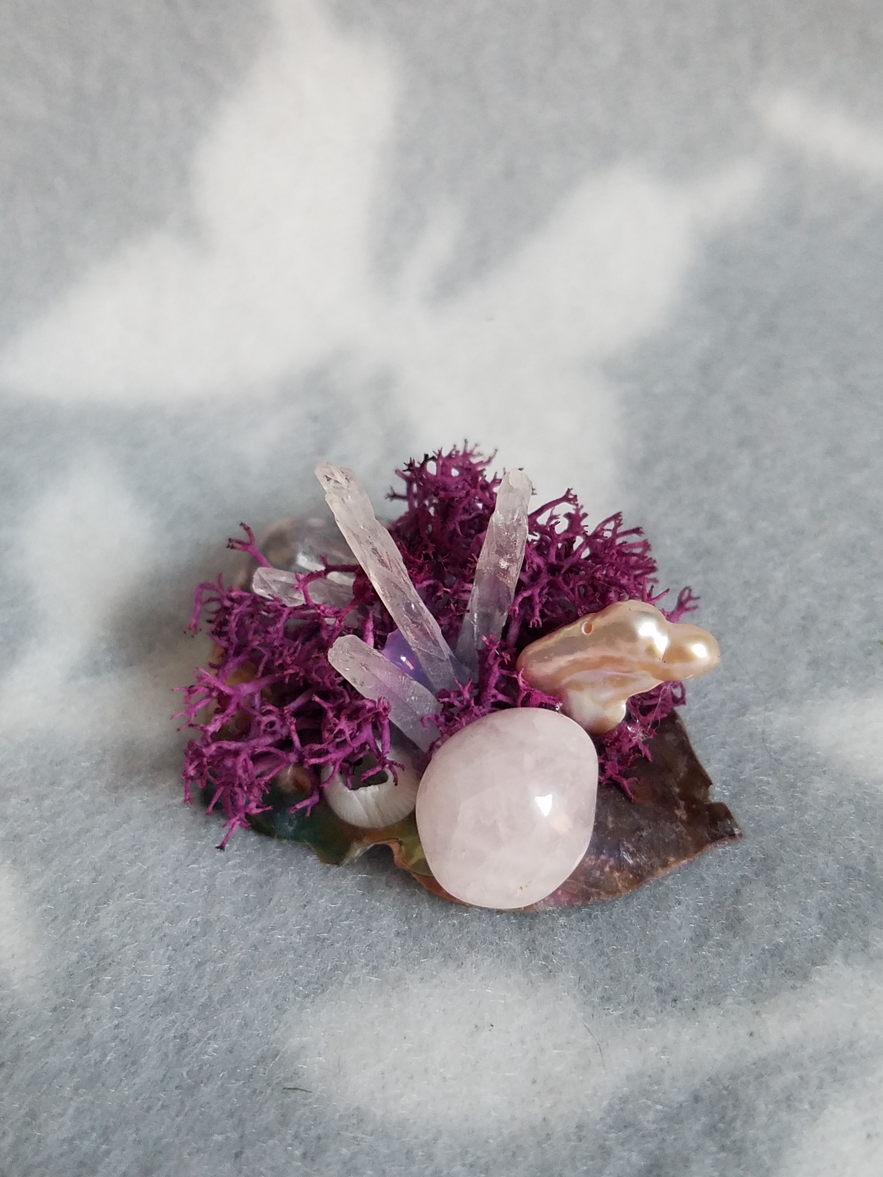 This altar contains quartz for healing and meditation, rose quartz for friendship and love and pearl. There are also an assortment of shells, collected from Florida's Shell Island.