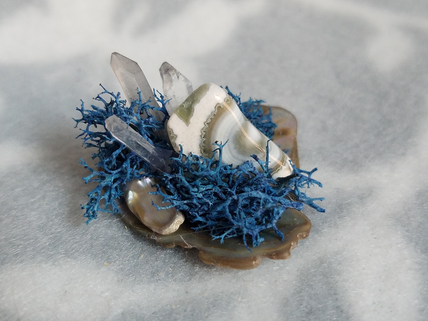 This altar contains quartz for healing and meditation. It features a gorgeous piece of ocean jasper for aid with depression with some freshwater pearl. There are also an assortment of shells, collected from Florida's Shell Island.
