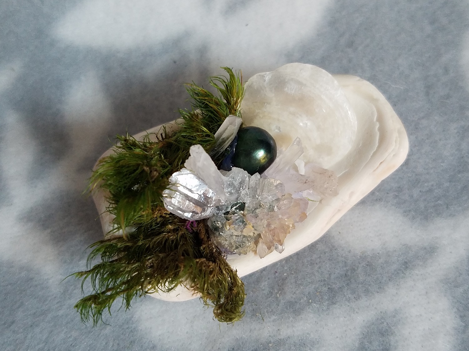 This altar contains amethyst and quartz healing and meditation, with jingle shell and pearl accents. There are also an assortment of shells, collected from Florida's Shell Island.