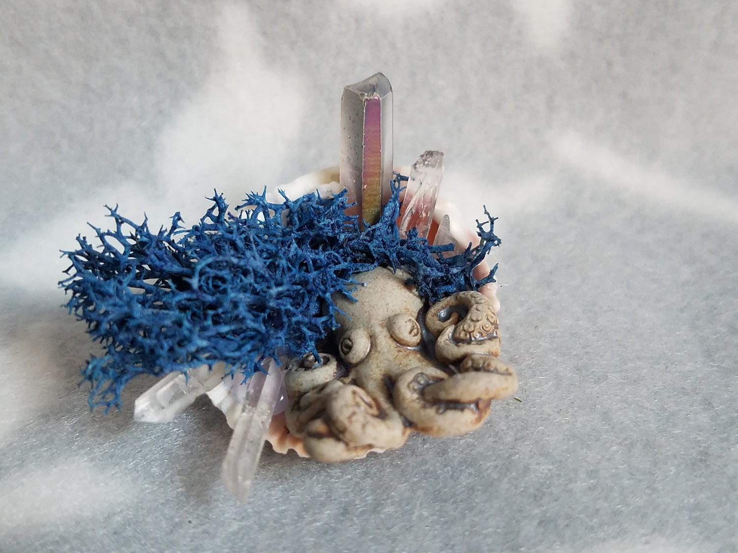 This altar contains quartz and aura quartz for healing and meditation.There is an octopus clay bead all inset into a cute scallop shell. There are also an assortment of shells, collected from Florida's Shell Island.